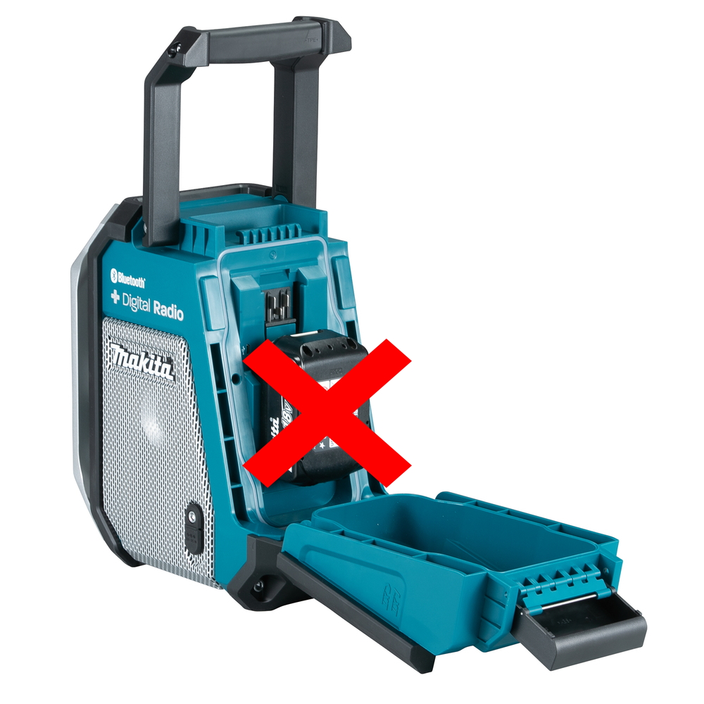 Das Radio kann mit allen Makita-Li-Ion-Schiebeakkus von 10,8 V bis 18 V betrieben werden (nicht kompatibel mit maktec- oder G-Serie-Akkus). Zusätzlich wird ein Netzteil mitgeliefert, das für dauerhafte Stromversorgung sorgt (Akkus werden nicht geladen).