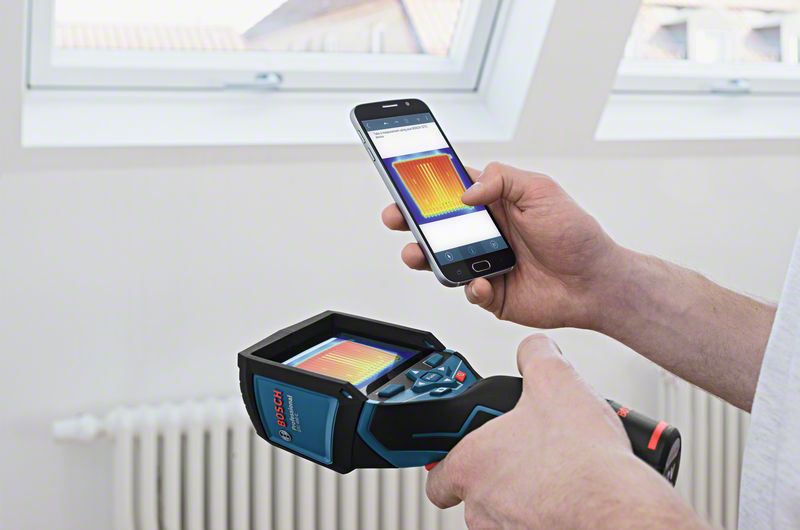 Mit der Wärmebildkamera GTC 400 C Professional werden Temperaturunterschiede in Sekundenschnelle gemessen und sichtbar gemacht und die Ergebnisse einfach dokumentiert. Über die Bosch Measuring Master App werden die Messwerte ohne Verzögerung dokumentiert und übertragen. Im Rahmen der intelligenten Bild-in-Bild-Technologie erfolgt eine Überlagerung von detaillierten Echt- und Wärmebildern (19.200 Bildpunkte), woraus ein qualitativ hochwertiges Bild entsteht, das die eindeutige Lokalisierung von Temperaturunterschieden ermöglicht. Dank Dual Power Source-System kommen für die Stromversorgung sowohl ein 12-V-Li-Ion-Akku als auch Standard-Alkalinebatterien in Frage.