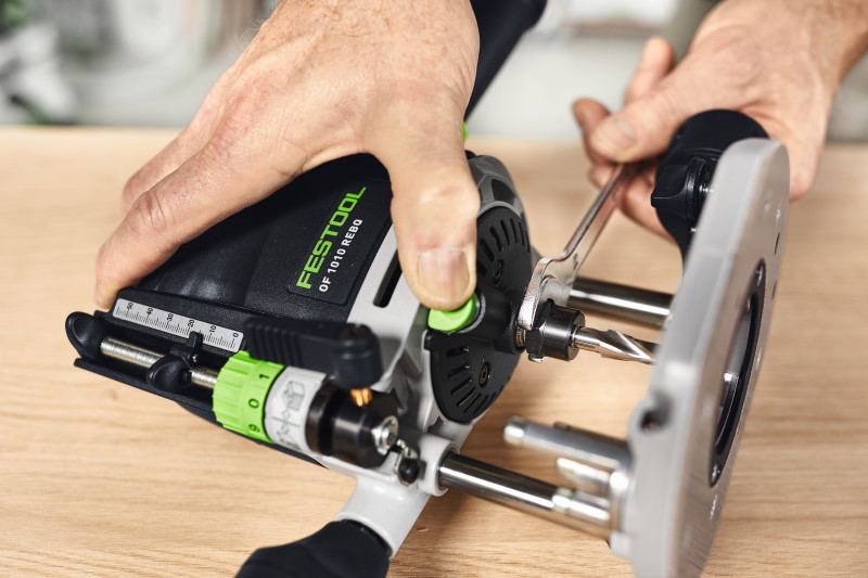 Die Frästiefe kann sekundenschnell 1/10 mm genau eingestellt werden. Dank gut zugänglichem Arbeitsbereich gelingt der Fräserwechsel schnell und sicher.