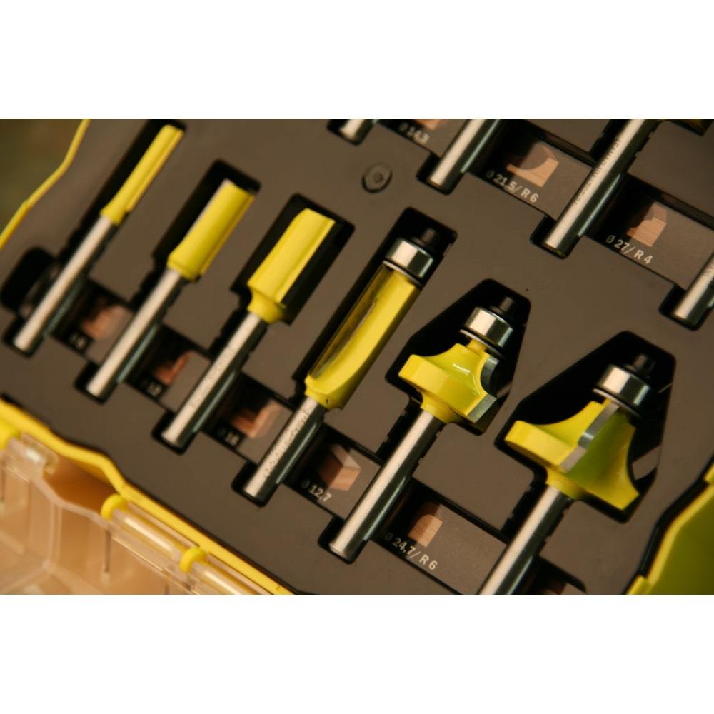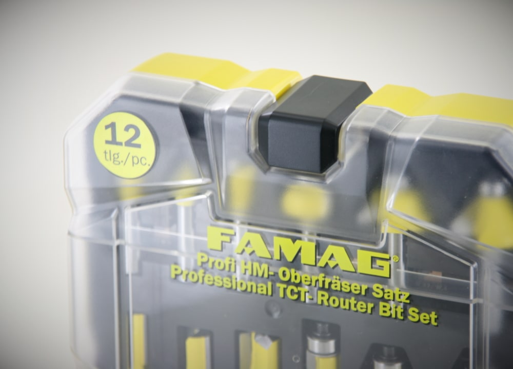 - Ordnung und Sicherheit: Die Kunststoffkassette schützt die Fräser und sorgt für eine geordnete Aufbewahrung.
