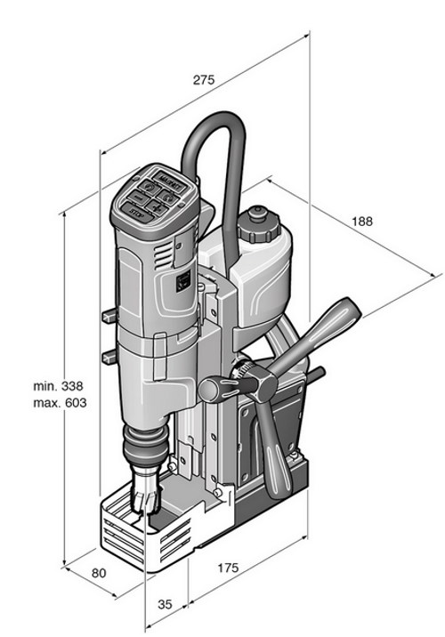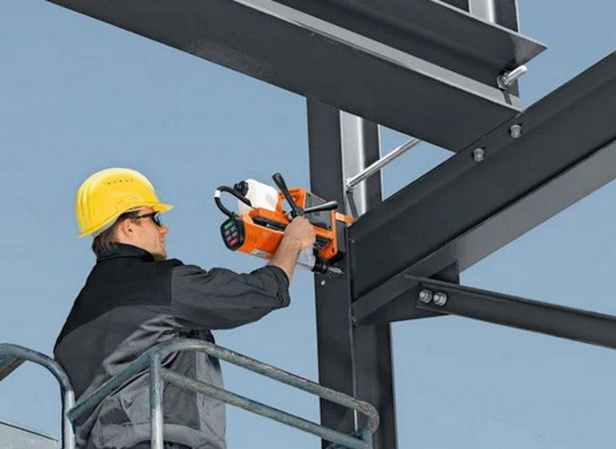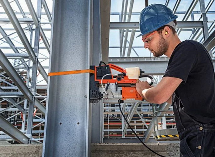 Die Fein KBU 35 QW ist eine Universal-Magnet-Kernbohrmaschine mit einer Nennaufnahme von 1.100 Watt und einer Leistungsabgabe von 550 Watt. Sie hat eine Lastdrehzahl von 130 - 520 min⁻¹ und kann HM Kernbohrer bis zu einem maximalen Durchmesser von 35 mm verwenden. Die Bohrtiefe für Kernbohrer beträgt maximal 50 mm, für Spiralbohrer maximal 16 mm. Die Maschine kann auch zum Gewindebohren bis M 14, Senken bis zu einem maximalen Durchmesser von 31 mm und Reiben bis zu einem maximalen Durchmesser von 16 mm verwendet werden.
