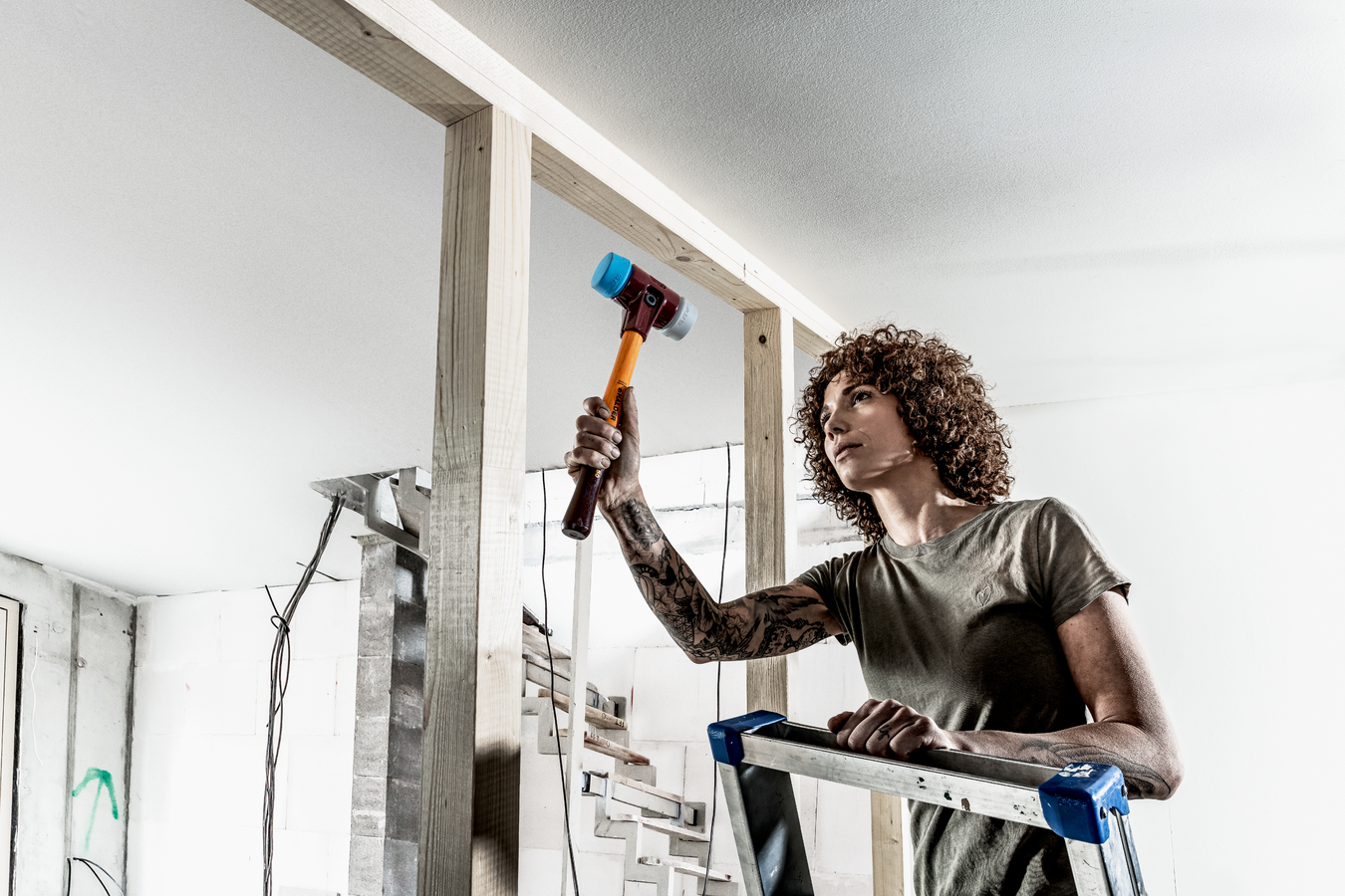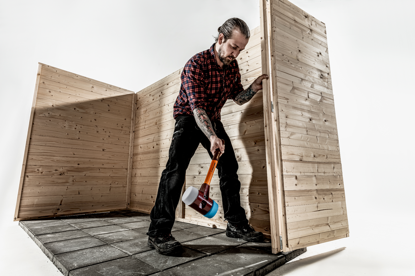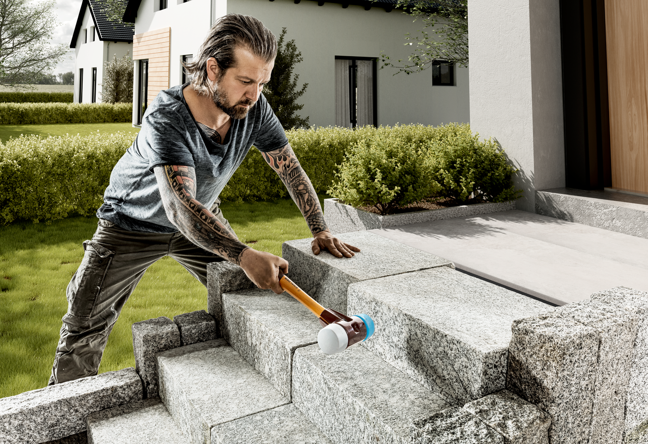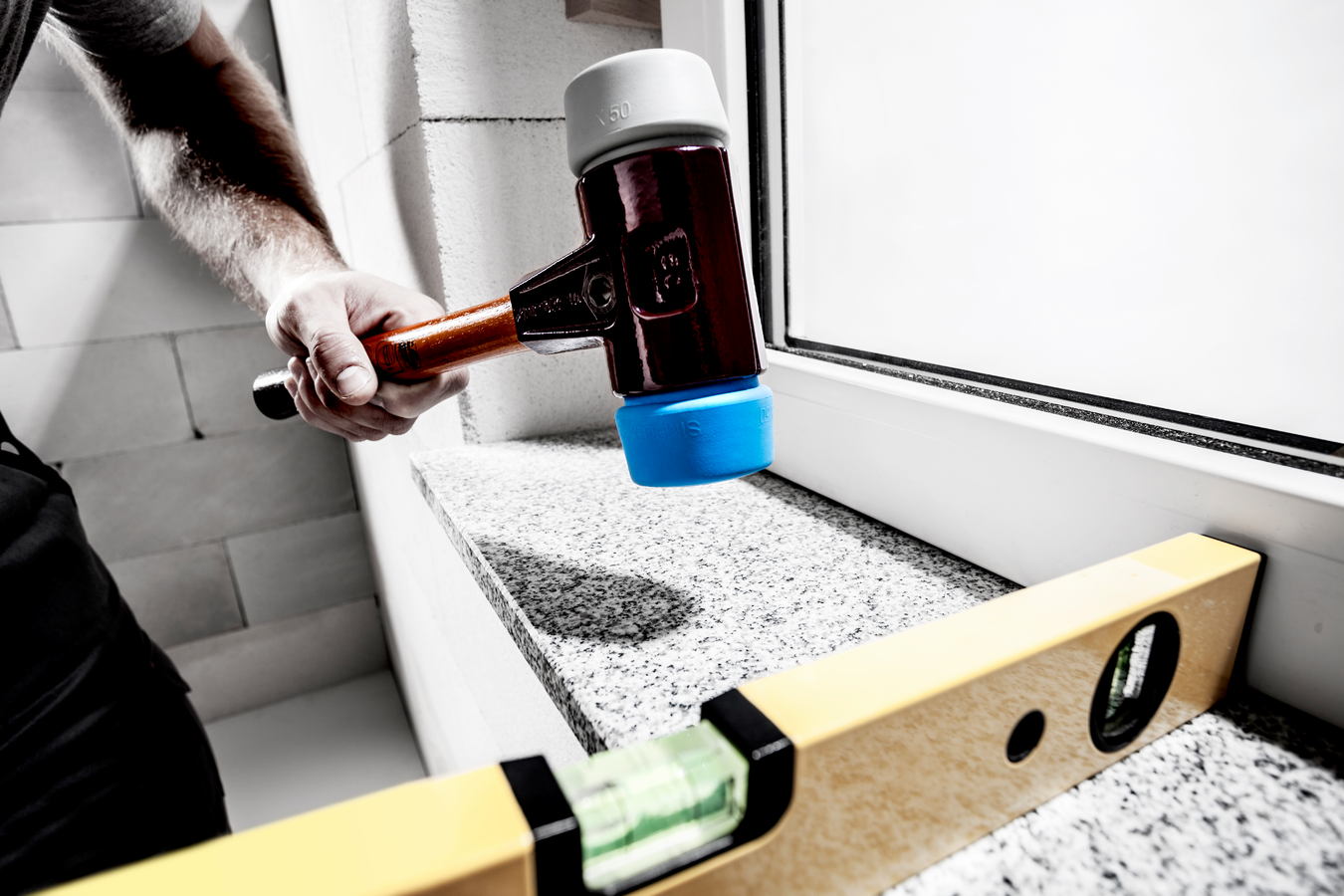 - SIMPLEX–Schonhammer in der Einsatzkombination TPE-soft (blau, weich, abriebfrei) / TPE-Mid (grau, mittelhart, abriebfrei).