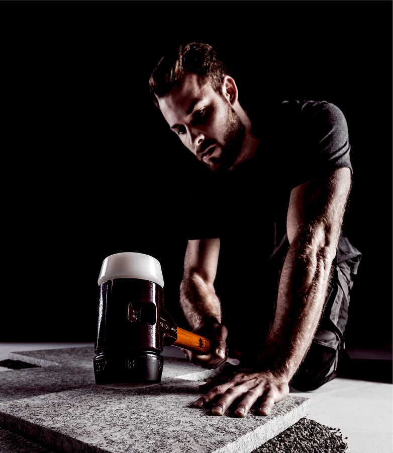 - SIMPLEX–Schonhammer in der Einsatzkombination Gummikomposition (schwarz, mittelhart, dämpfend, geruchsneutral, verschleißarm) / Superplastik (weiß, mittelhart, sehr widerstandsfähig).