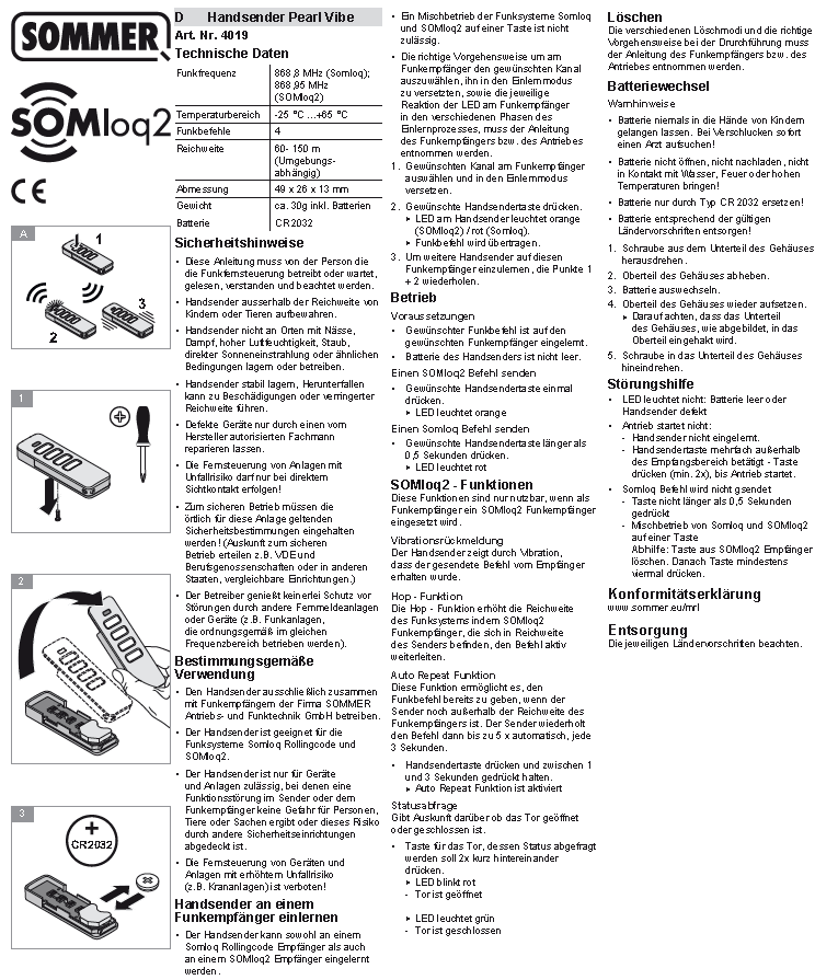 Produktinformationen "SOMMER Handsender PEARL-VIBE 4-Befehl 868,95 MHZ mit Rückmeldung"