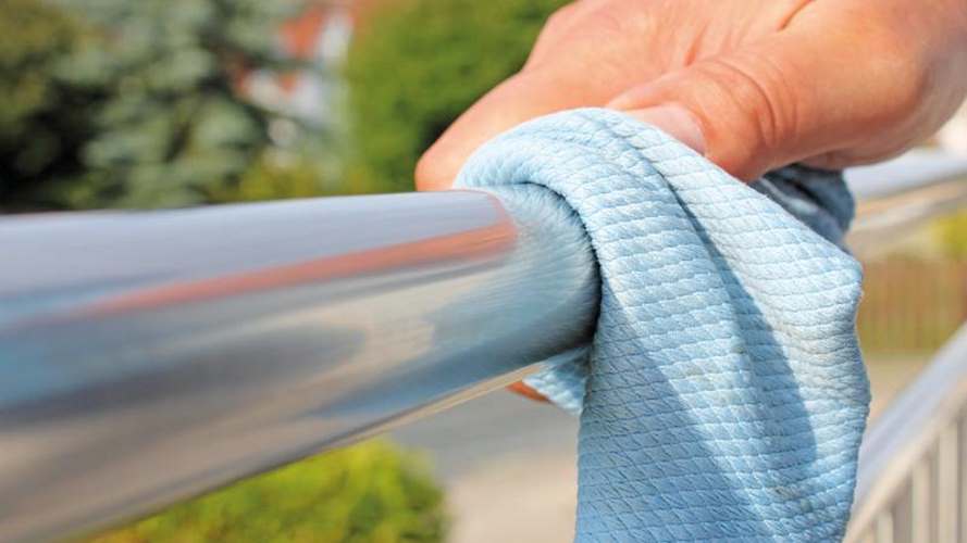 Leichtes und dosiertes Aufsprühen, lässt sich rückstandsfrei einarbeiten, kein Scheuern auf der Edelstahlfläche, mit trockenem und fusselfreien Tuch, leichte bis mittlere Verschmutzungen lassen sich problemlos entfernen, lässt Wasser abperlen