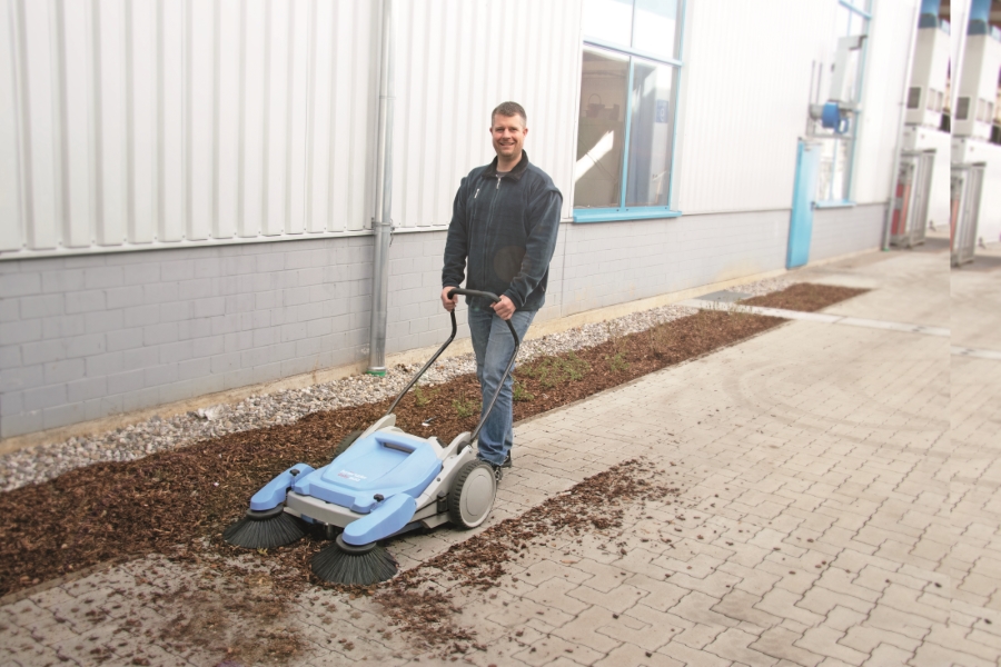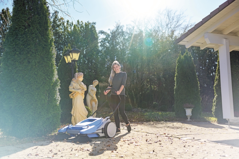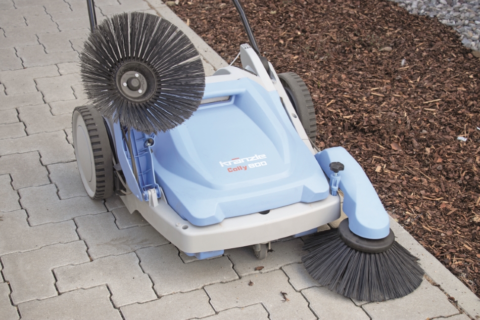 Die leichtgängige Kränzle Colly 800 nimmt durch ihre Doppelbeborstung (harte und weiche Borsten im Wechsel) Staub, Zigarettenstummel, Laub, kleinere Plastikteile und Metallteile sicher im großen Kehrgutbehälter auf.
