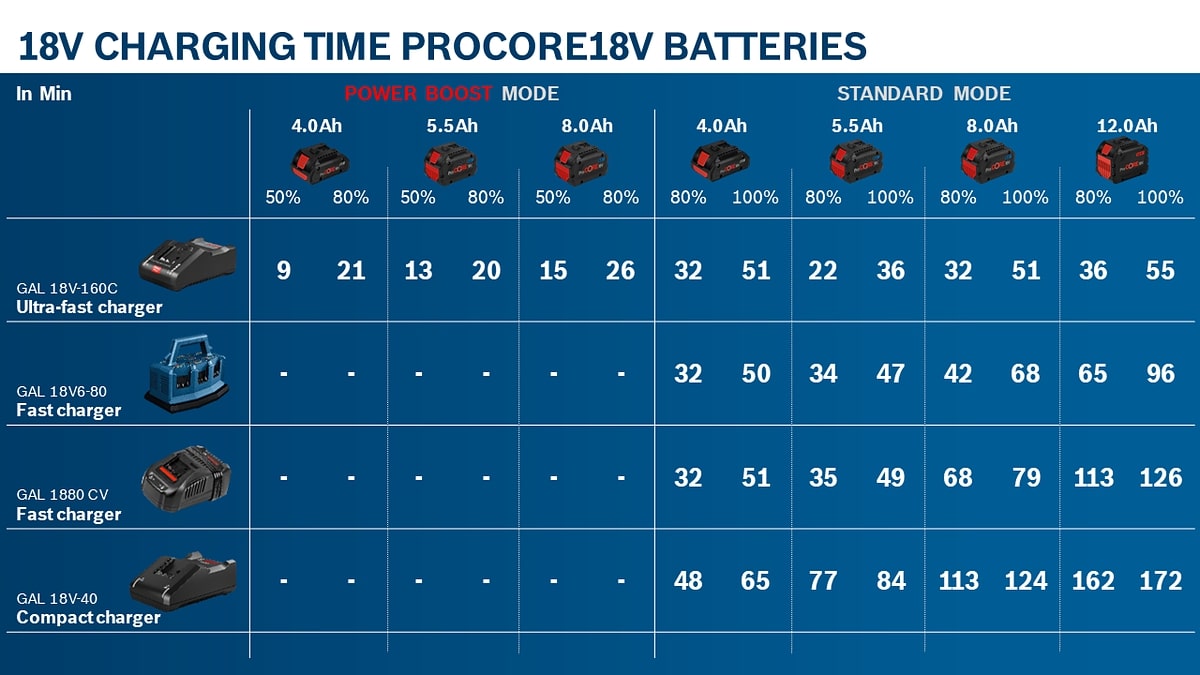 | Ladezeit ProCORE18V 4.0Ah (80 %/100 %) ca.* | 48/65 min |