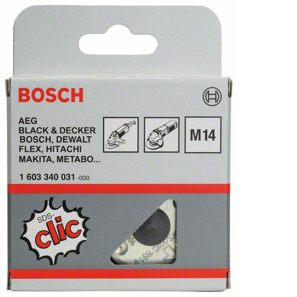 Die SDS-Clic M14 ist eine schnellsichernde Spannmutter zum schnellen und einfachen Spannen und Lösen von Winkelschleiferzubehör wie Schleiftöpfen, Diamanttrennscheiben und Schleifscheiben. Sie ist geeignet für alle Winkelschleifer mit Gewinde M 14 und einem Produktionsdatum ab 08/90. Die Scheibe muss beim Zentrieren am Stützflansch ausgerichtet werden und nicht an der Mutter. Der Gewindeüberstand über das stärkste Werkzeug darf nicht mehr als 6 mm betragen.