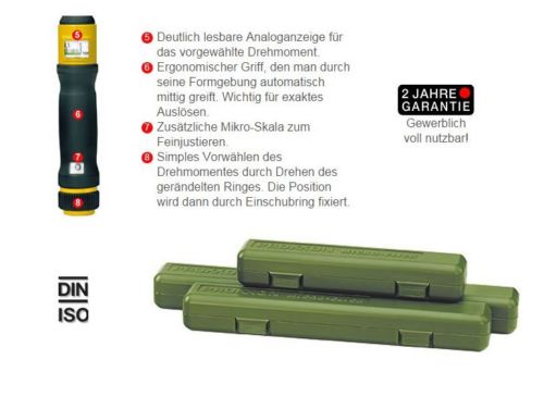 Einstellen des Drehmomentes durch Drehen des gerändelten Ringes am Griffende. Durch Einschub des Ringes wird der gewählte Wert fixiert. Gut lesbare Analoganzeige mit zusätzlicher Mikro-Skala zum Feinjustieren. Skalenring mit 0,4 Nm-Teilung. Antrieb durch 1/4"-Vierkant (6,3 mm) mit Adapter für 1/4"-Standard-Schrauberbits. Umschaltbar von Rechts- auf Linkslauf. Genauigkeit +/- 4%. Gesamtlänge 195 mm.