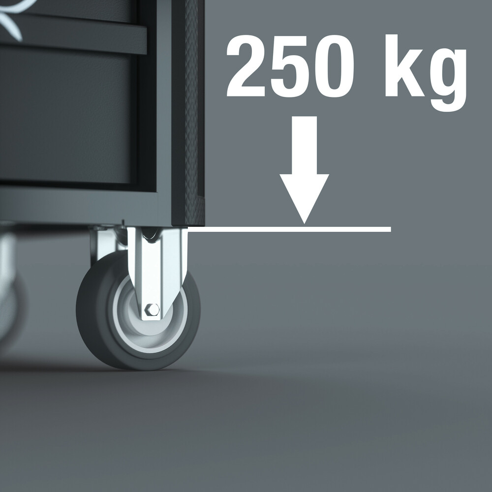 Das Hochleistungs-Fahrwerk mit 250 kg belastbaren Rädern und Doppelstopp an den Lenkrollen gewährleistet einfache Bewegung und sicheres Feststellen.