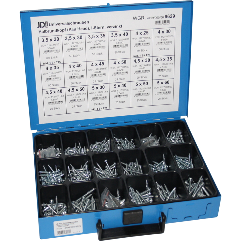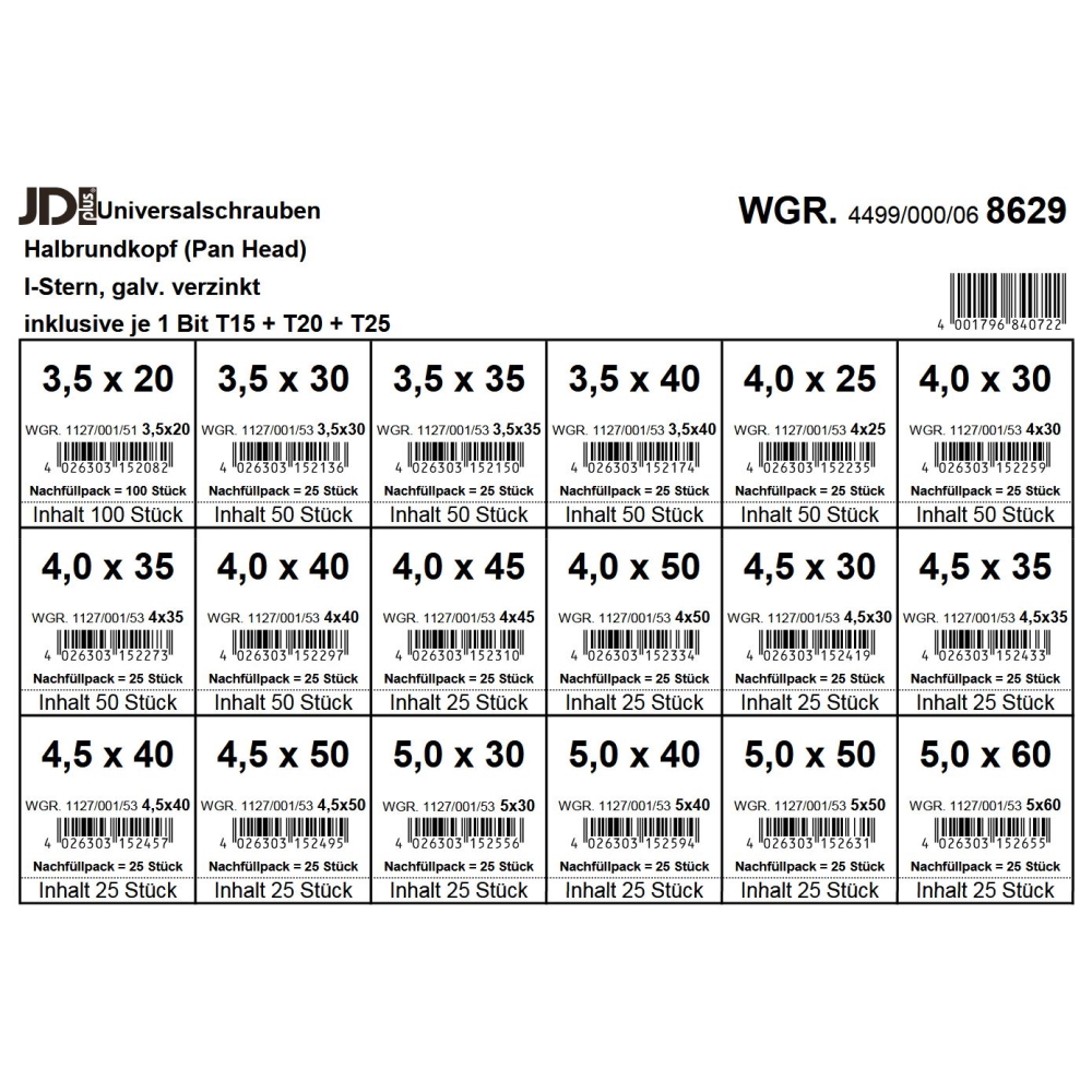 je 25 Stück: 4,0x45mm, 4,0x50mm, 4,5x30mm, 4,5x35mm, 4,5x40mm, 4,5x50mm, 5,0x30mm, 5,0x40mm, 5,0x50mm, 5,0x60mm