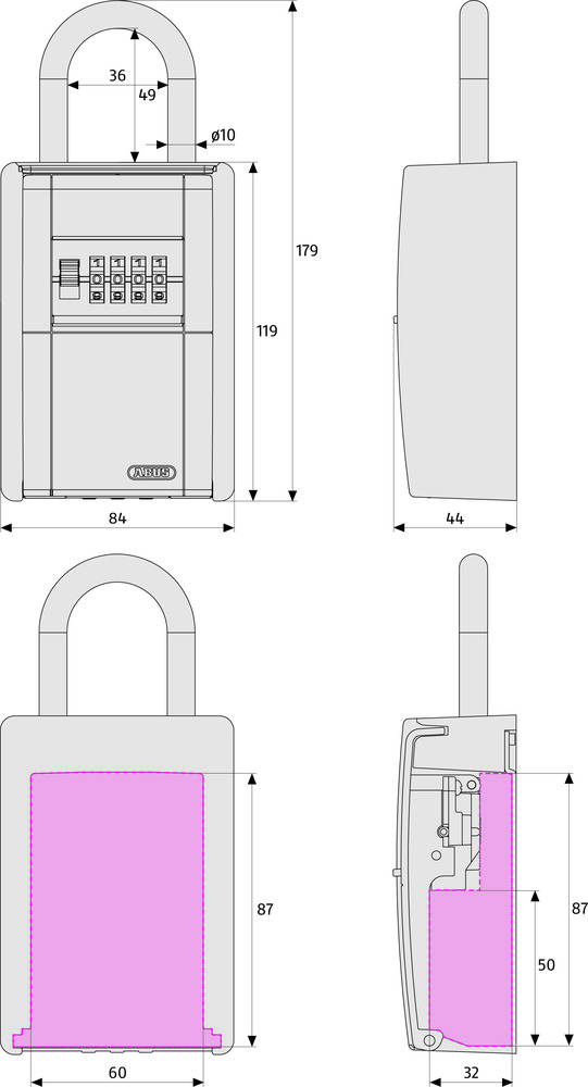 - Außenmaße des Gehäuses: 84 x 119 x 44