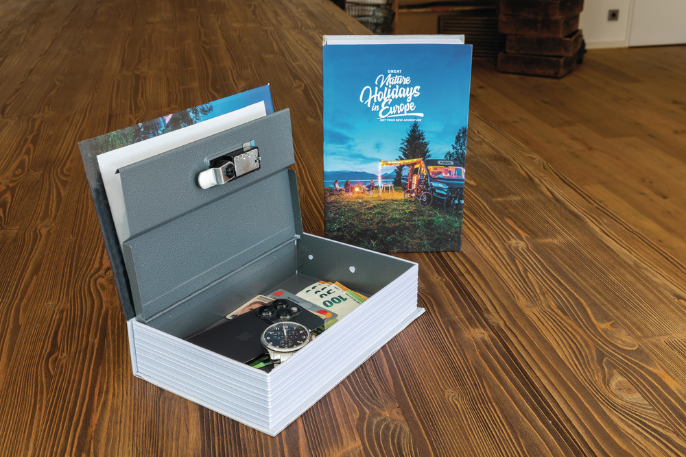 Unser Book Safe wird im Bücherregal zum unauffälligen Aufbewahrungsort für Wertgegenstände, die fremden Augen verborgen bleiben sollen. Denn der Safe mit authentischem Hardcover und angedeuteten Seiten lebt von der Täuschung.